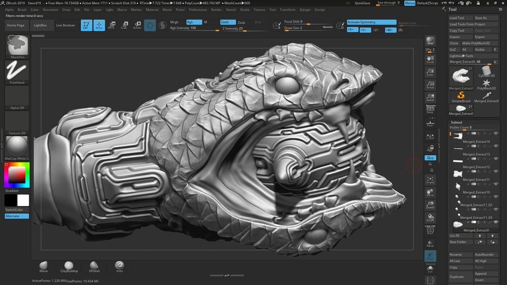 After we create the blockout model in 3DS MAX we are going to import it to ZBrush where we then use Zremesher and other tools in preparation of the highpoly modeling. This multiple hour long chapter of the tutorial aims to make you a ZBrush expert as we combine organic (skull and snake head) with hard surface elements. Learning by doing as we create our sword highpoly model and make use of any feature and function that helps us getting the most out of ZBrush.
